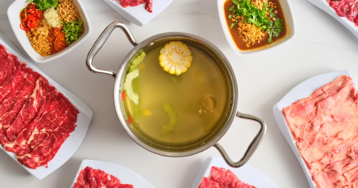 - Ngăn nước hầm xương: Được ninh chậm trong 6-8 tiếng từ xương ống bò, thêm củ cải và gừng. Nước trong vắt, vị ngọt thanh khiết, dùng để nhúng thịt và cảm nhận vị nguyên bản.
